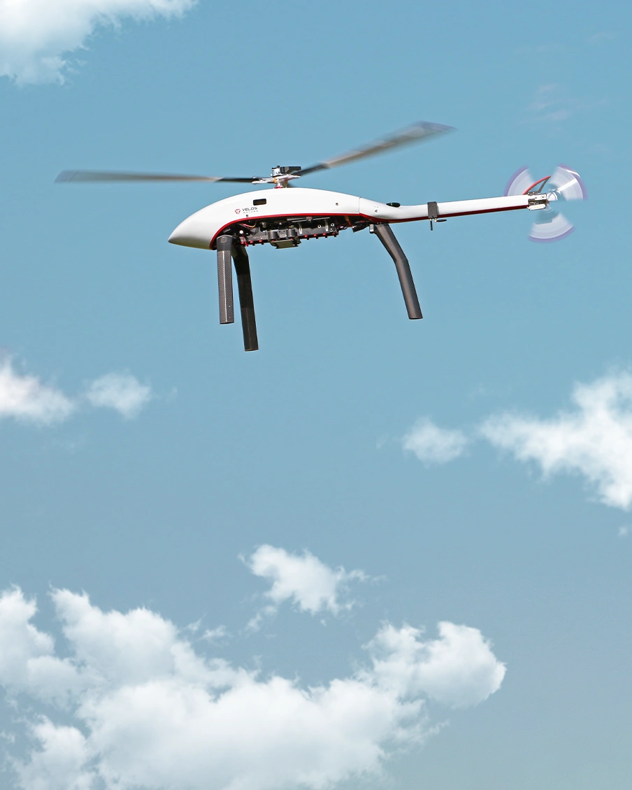Velos V3 is our electric, single rotor UAV helicopter, with over 10 years on the market and hundreds of units sold worldwide, establishing it as a well-proven platform. Designed entirely from scratch, our heavy lift UAV offers unparalleled reliability, ease of use, and exceptional performance, even in weather conditions where other systems cannot operate.