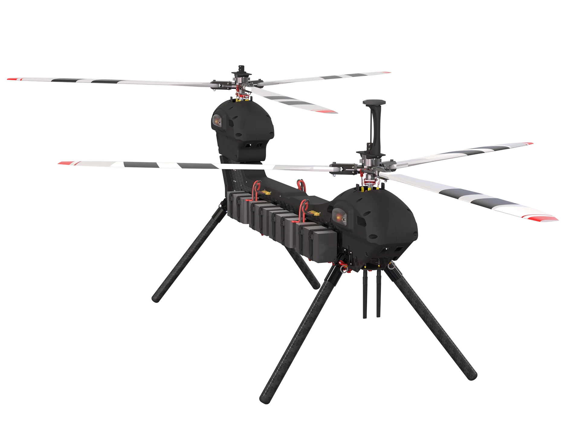 The next big step in UAV technology, the heavy lift V-Twin is an engineering marvel, designed to redefine the payload-carrying capabilities of modern unmanned systems. It is a tandem UAV helicopter with two synchronized main rotors mounted on offset planes, which allows the blades to intermesh, delivering exceptional performance in a compact form.